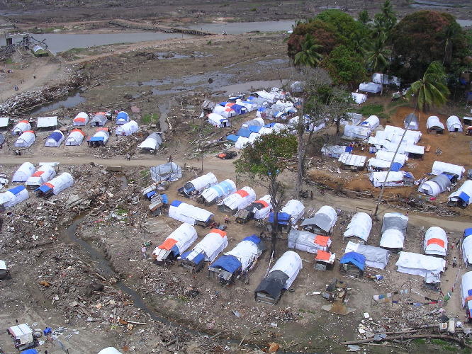 L’aide internationale s’est déployée très rapidement, et de nombreux pays ont envoyé des équipes de protection civile, souvent équipées pour la recherche-déblaiement. Des camps de déplacés se sont créés sur une grande partie de la zone touchée, avec les enjeux de mise en place d’abris pour les populations, afin qu’on puisse leur apporter eau et nourriture. Le système des Nations unies s’est rapidement mis en ordre de marche, avec l’ensemble des agences humanitaires pour la réponse et OCHA et le PNUD qui ont assuré la coordination des acteurs de l’aide.  Les aides bilatérales après le tsunami ont été importantes, avec différents niveaux d’engagement, principalement par l’intermédiaire d’ONG et d’agences de l’ONU, mais aussi avec une forte composante de financement en faveur des institutions nationales par des fonds à court terme tout d’abord puis rapidement par des approches à plus long terme.