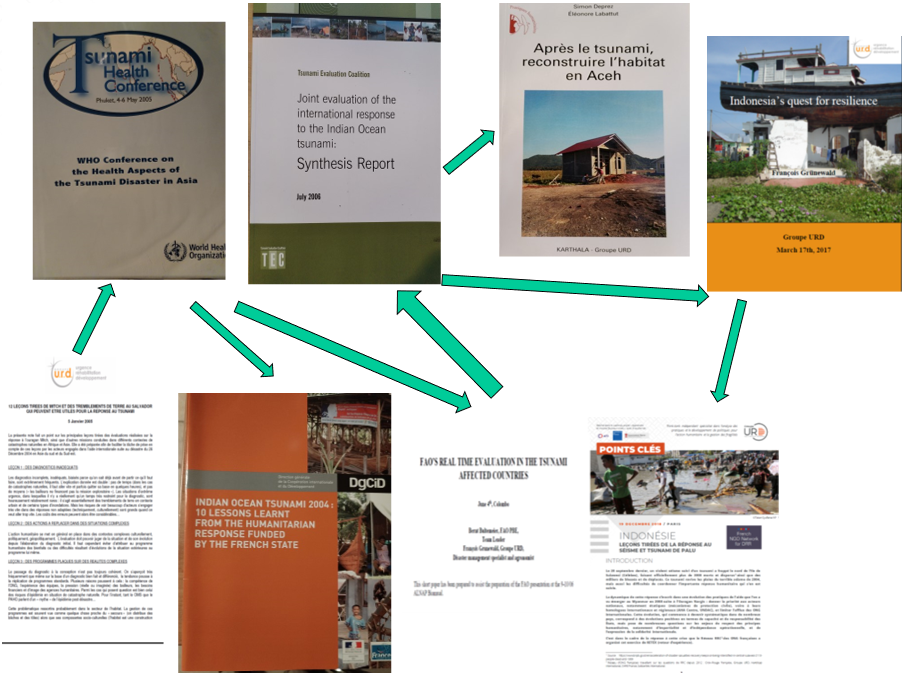 La mobilisation de ressources financières de la société civile internationale et des états à la suite au Tsunami a déclenché un processus complexe d’évaluations. Côté français, le dispositif assez original, la Délégation Interministérielle Post-Tsunami (DIPT) chargée de coordonner la mobilisation de ressources considérables pour l’Etat français en dehors de sa zone classique d’intervention a commandité une évaluation. Les instances parlementaires (Sénat, Assemblée nationale) ont monté des missions d’information L’aide française aux victimes du tsunami en Indonésie rapport Blum pour le Sénat) tandis que la Cour des Comptes produisait un rapport « L’aide française aux victimes du tsunami du 26/12/2004 ». Aux côtés de ces évaluations portées par les institutions, une multitude d’autres exercices s’est déroulée, portés par des Universités (Paris XII-Créteil), des bailleurs de fonds (Fondation de France), des ONG (Collectif Enfants Isolés d’Asie, etc.).
