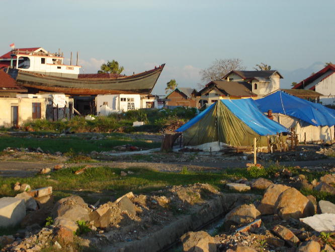 The distribution of tents and tarpaulins to shelter the homeless led to the creation of dozens of camps in the few days after the Tsunami. Months later, most of the tented camps were still there, while the presence of displaced people in public institutions became more permanent. Rebuilding housing took time, and temporary solutions tended to become permanent. The logistical, administrative, legal, land and building materials supply constraints (with prices rapidly spiralling out of control) and implementation timescales varied widely. Some players wanted to go straight from tents to sustainable houses, but found themselves blocked by the regulations of certain humanitarian donors who did not want their emergency funds to be used to build something sustainable, and in particular to lay cement foundations of a certain size on the ground. The number of so-called ‘transitional’ buildings increased, and they too changed from ‘transitional’ to ‘sustainable’.