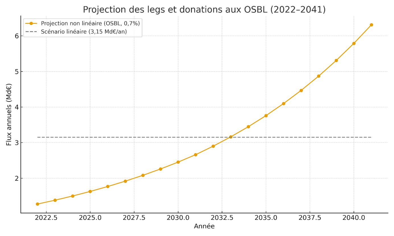 Ce scénario conduit à une montée en puissance progressive des flux, passant de 1,271 milliard d’euros pour les organisations d’intérêt général en 2022 à plus de 2 milliards par an en début des années 2030, puis au-delà de 4 milliards à l’horizon 2040.